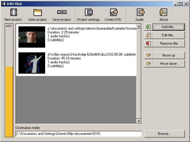 DVD Flick mira ad essere un semplice, ma allo stesso tempo potente strumento di authoring di DVD. Si possono prendere un certo numero di file video memorizzati sul computer e trasformarli in un DVD che potrà essere riprodotto sul lettore DVD, Media Center o Home Cinema Set.