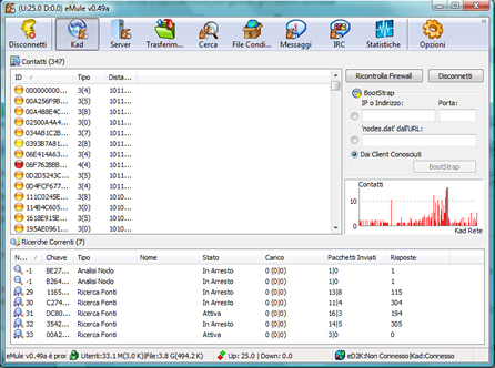 Di contro avremo un allungamento dei tempi di ricerca, ma non troppo evidente. Resta da capire come utilizzare la rete Kad con il nostro mulo, vediamo. Innanzitutto è necessari scaricare ed installare l’ultima versione da qui una volta avviato emule in alto avrete il pulsante Kad, cliccandoci si aprirà una nuova finestra e sulla destra dovrete cliccare su connetti.