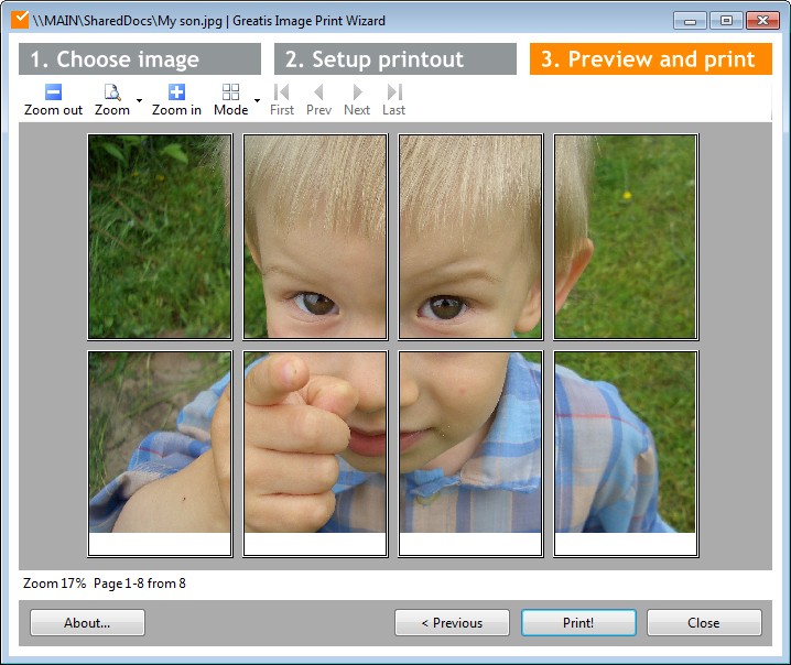 Con Image Print Wizard è possibile stampare poster di grandi dimensioni unendo fogli di tipo A4. Il software suddividerà automaticamente un’immagine per poterla stampare in 8 o più parti. L’immagine originale potrà essere successivamente ricostruita unendo le varie stampe.
